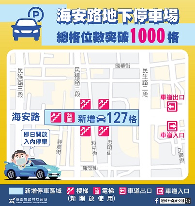 交通局局長王銘德表示,為使海安路周圍路段車流更加順暢,減少民眾排隊等待或繞駛尋找停車格位的時間,市長黃偉哲多次指示交通局規劃運用海安路地下1層商場空間擴大提供停車供給;期間因考量大型地下停車場的整體安全,擴建工程施工期間一併進行全場消防設備更新作業,同時為了讓民眾更方便進出停車場,擴大使用的停車區域同步開放5座樓梯與2座電梯通行,提供民眾更安全更便利的停車環境。