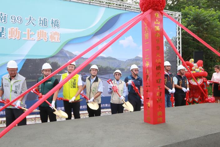 今天的動土典禮,由副市長趙卿惠代理黃偉哲市長主持,市議員張世賢、王宣貿及李宗翰等也前來參與。趙卿惠表示,黃偉哲市長相當重視大新營區的整體發展,在大新營區,不管是橋樑改建、道路拓寬及特色公園興設,總共已投入72億元,本次改建東山區大埔橋,更是一件相當重要的建設工程,希望透過這項交通建設,為地區帶來更好服務,給民眾帶來更富裕生活。
