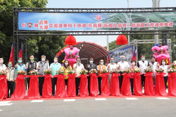 【民進日報記者凃政宏台南報導】台南市長黃偉哲支持中央沙崙綠能產業開發,積極推動台南市綠能及觀光交通便捷網,極力向中央爭取經費,於台南高鐵特定區周邊開闢往來歸仁、關廟市區的道路,今(20)日交通部公路總局辦理「台86線武東大潭交流道東向下匝道(往高鐵)拓寬及高發二路新闢工程」通車典禮,黃偉哲也到場感謝公路總局,提早竣工,減輕尖峰時段交通壅塞的問題。