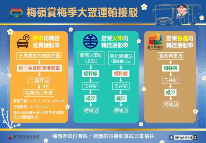【民進日報記者凃政宏台南報導】台南市楠西梅嶺梅花綻放吸引不少遊客前往賞梅,因停車空間有限,為紓解大量車潮湧入梅嶺山區,交通局自1月6日啟動假日接駁服務,呼籲自行開車民眾倘山區停車位已滿或道路交管時,可將車輛停放於「芒果農創玫瑰綠柏園」(位於台3線旁)搭乘免費接駁車上山,另也可在玉井轉運站搭乘綠22線公車前往,呼籲多加利用公共運輸。