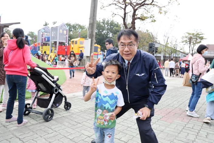 【民進日報記者凃政宏台南報導】以火車站為主題的仁德運動公園特色遊戲場今(3)日正式啟用,可愛的糖廠五分車頭造型搭配大型沙坑、溜滑梯以及攀岩板等多樣化的設施,吸引不少家長帶小孩子前來遊玩;台南市長黃偉哲也特地手持搖鈴、化身列車長現身,與現場小朋友們開心互動,展現童心未泯的一面,立法委員王定宇、陳亭妃,市議員郭鴻儀、陳皇宇皆到場表達關心。
