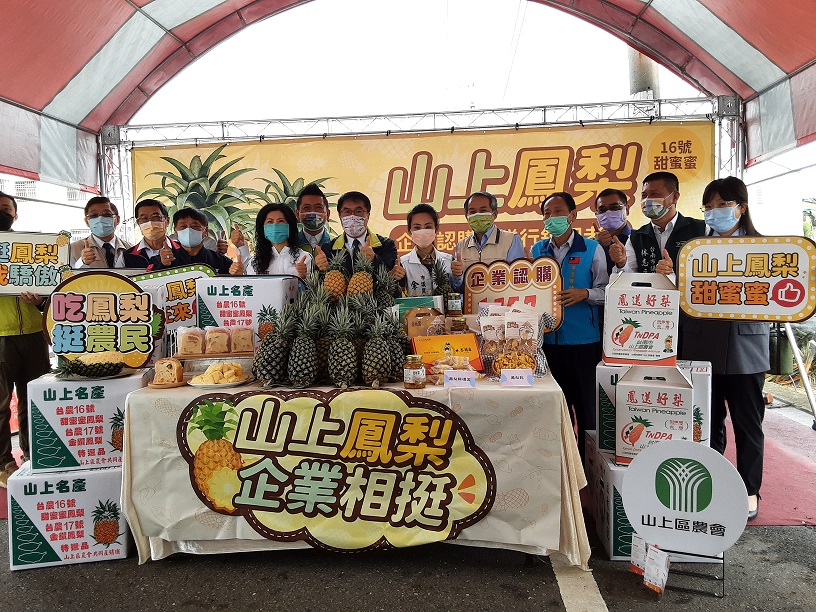 山上區公所結合山上區農會於鳳梨盛產季節,特別規劃以食當季、吃在地「台農16號-甜蜜蜜鳳梨」為主題,於昨日上午9時30分在山上通往善化市道旁鳳梨園,舉行農產品企業認購暨捐贈行銷記者會,以實際行動力挺農產品,推廣山上鳳梨的美味。