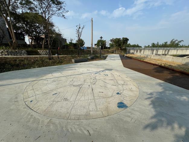 此外值得一提的是,再往北邊的虎頭溪與嘉南大圳交會處,渡槽橋旁本被占耕,也在這次的工程排占清理後,將步道端點整理為水痕廣場,以石材雕刻地坪刻劃新化小鎮街道與農田水路紋理。全段水綠步道兼具自然與人文空間鏈結、地區休閒生活空間升級、人文與生態教育結合等多層次效益,為新化地區居民提供一休閒散步好去處。