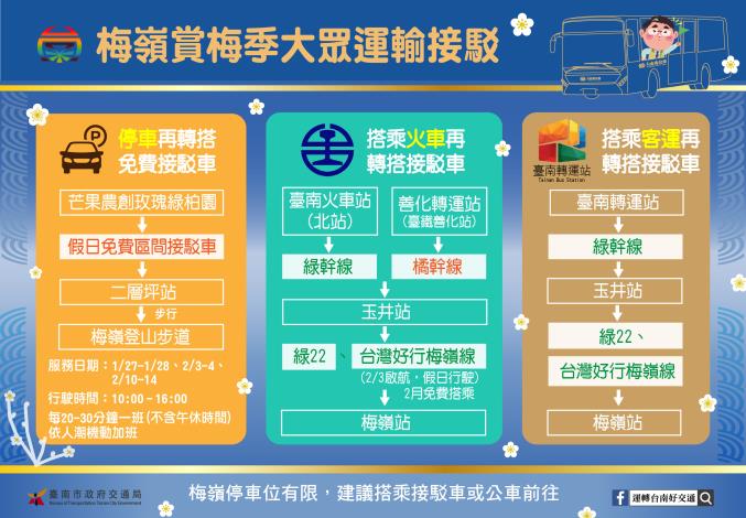 台南市政府交通局長王銘德表示,市長黃偉哲相當重視楠西梅嶺地區賞梅觀光盛事,特別指示年節期間要做好交通疏運,交通局提供「芒果農創玫瑰綠柏園」接至梅嶺二層坪接駁服務也加碼實施,自本周末(1月27日)起再延長持續至農曆春節期間,逢假日(2月8日小年夜、2月9日除夕除外)於1月27、28日、2月3、4、10~14日等共9日,每日上午10時開始至下午4時行駛,並依現場人潮機動加開班次。