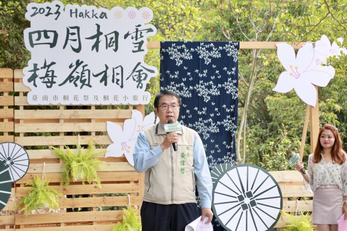 黃偉哲邀請共遊賞桐及認識客家文化。(記者蔡金旺攝)