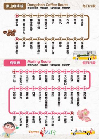 觀旅局長林國華表示,「東山咖啡線」串聯關子嶺風景區及175東山咖啡公路等景點,每日往返各7班次,共14班次;「梅嶺線」則是串聯玉井、鹿陶洋江家古厝及梅嶺風景區等景點,假日往返各6班次,共12班次。旅客到玉井還可結合小黃公車前往楠西龜丹泡溫泉,享受山線風光、品嚐美食,搭台灣好行,便利、環保,且經濟實惠,歡迎善用台灣好行暢遊台南,出發前可至台灣好行官網查( https://www.taiwantrip.com.tw/Frontend )查詢路線資訊。