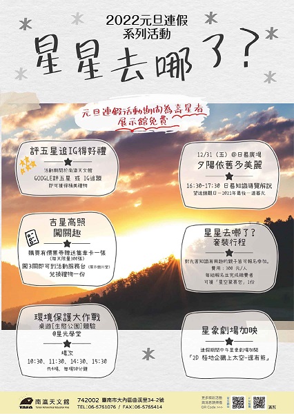 2022元旦連假活動期間(12月31日至1月2日)這3天生日的壽星朋友,南瀛天文館可免費參觀天文展示館、兒童科學館則是可免費遊玩親子科學遊戲區;另外南瀛天文館12月31日邀請您一起觀賞2021最後一道暮光「夕陽依舊多美麗」首次辦理,現場有專業人員介紹太陽大小事並架設望遠鏡讓您安全觀測太陽,活動完全免費!