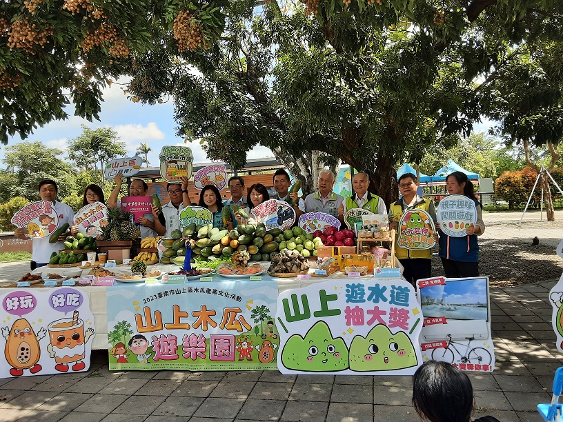 【記者蔡金旺台南報導】「2023臺南市山上區木瓜產業文化活動」將於26日在山上花園水道博物館西側停車場舉辦,昨日先行在水博館大門舉行記者會,市長夫人劉育菁代表市長黃偉哲參加,以及中華醫事科技大學創意料理研發團隊一起參加記者會,山上區長余基吉邀請市民共同來為山上區木瓜產業文化活動做行銷宣傳。