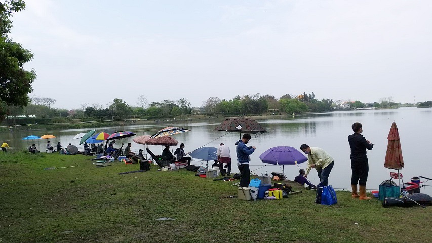 虎頭埤風景區大埤吸引眾多垂釣者釣魚。
