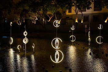 臺南市鹽水月津港親水公園月津港燈節4大展區66組藝術作品攜手國際藝術家綻放「光的年輪」 。
