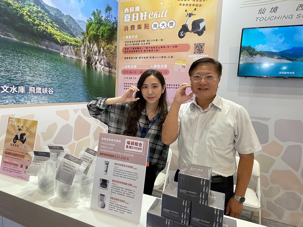呼應本次展會主題,仙境西拉雅主題館打造成溫泉浴池與櫃台與場景,呈現關子嶺溫泉場域既視感,彷彿身歷其境瞬間來到關子嶺,此外更邀請台南溫泉協會參展,特別推出泥漿溫泉福袋組,包含總價值達6,759元的泥漿溫泉泥膜、泡澡球、洗顏霜、萬國通路收納手提箱,並結合2024年臺南燈會推廣旅遊臺南最超值的優惠組合,總價值超過25,000元的台南旅遊美食護照,集結全臺南600家業者優惠內容,並有5大項優惠抵用券,有6,200元飯店民宿溫泉住宿抵用券、5,000元的餐廳美食泡湯抵用券、臺南古蹟門票、觀光工廠兌換券以及60家以上伴手禮可供選擇,福袋總價超過3萬元,旅展限定特惠價只要4,580元。