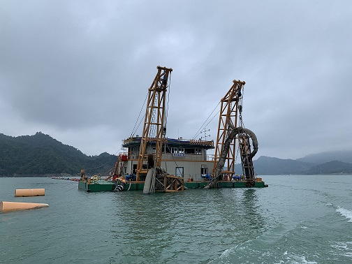 南區水資源局全年無休由曾文疏濬2號在曾文水庫抽泥。(記者蔡金旺攝)