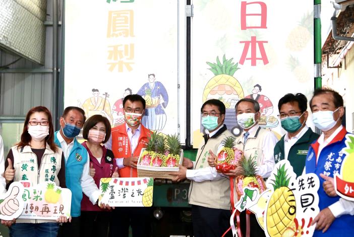 【民進日報記者凃政宏台南報導】臺灣鳳梨去(110)年遭中國公告禁止輸入,但在農民團體、外銷業者及政府相關單位的共同努力下,110年臺灣鳳梨外銷成果仍相當顯著,為延續海外銷售熱潮,特於今(6)日舉辦「臺灣鳳梨 風潮再現」外銷日本記者會,藉由今日舉辦鳳梨輸日封櫃儀式,一併感謝日本消費者對於臺灣鳳梨的熱烈支持,農委會主委陳吉仲和臺南市長黃偉哲同時出席見證,替臺灣鳳梨的外銷成績感到開心。立法委員賴惠員,市議員吳通龍、陳秋宏、尤榮智也到場祝賀。
