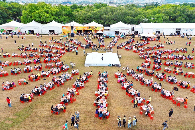 現場千人圍坐圓桌以放射狀排列,從空中俯瞰有如一朵美麗的太陽花,活力四射, 透過傳承的祝禱儀式,以有機茶封存美好初心,提醒你我莫忘齊心共善,為環境永續盡ㄧ分心力!