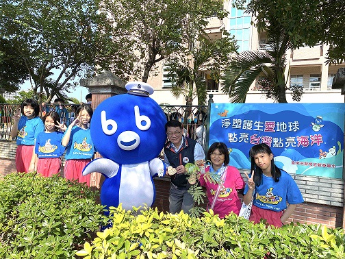 廣受師生喜愛的「海洋保衛隊」隊長bb,與台南新泰國小校長及淨塑小講師合影。