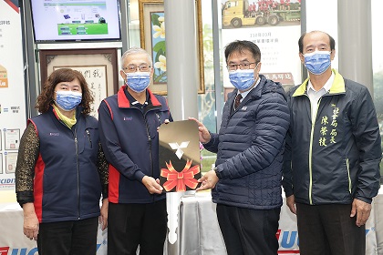 黃文献及王玉飛捐贈物資車黃偉哲和陳榮枝代表受贈。(記者黃伃綵攝)