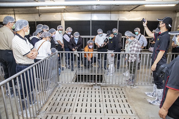 為何選擇500頭肉豬規模的畜舍作為建置規模呢?畜產試驗所組長蕭庭訓說明,這模組化標準肉豬舍,適合5,000頭規模一貫場,採3週批配種,每批次500頭,豬場可依照飼養規模以「棟」為單位參考建置,並結合單場引進豬種與統進統出的飼養模式,降低疾病垂直感染機率,提高豬隻育成率。此一模組化的設計概念也讓林聰賢董事長讚不絕口,認為未來也可將建築設計概念套用到不同需求的畜舍設計規劃中。