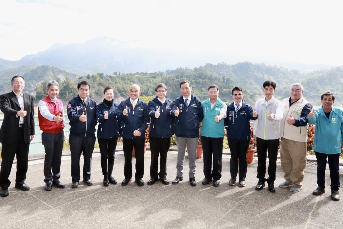 行政院長蘇貞昌視察曾文水庫水情並與隨行人員合影 。(記者蔡金旺攝)
