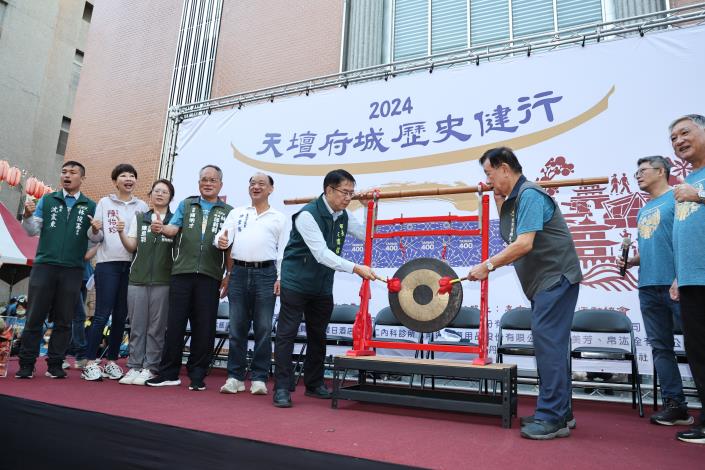 台灣首廟天壇董事長徐國潤與台南市黃偉哲共同敲鑼起跑。(記者蔡金旺攝)