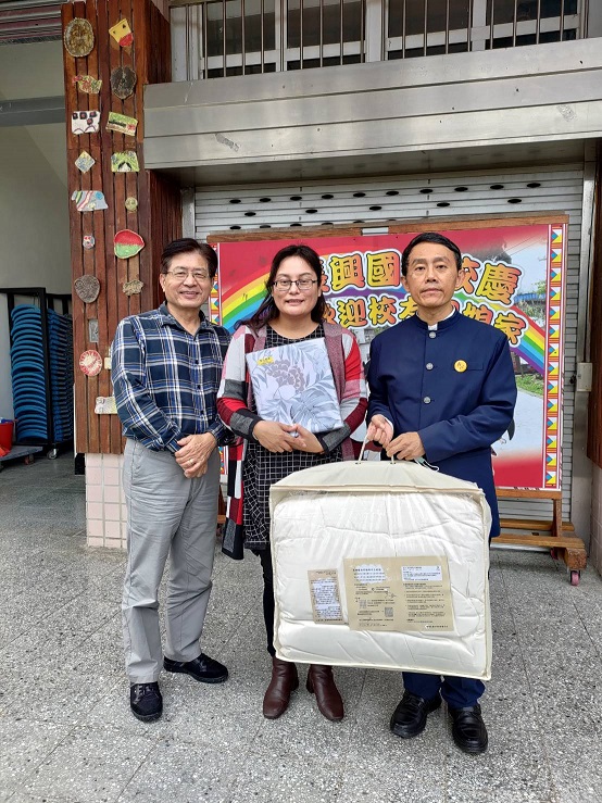 福智團體月稱光明寺捐贈有機暖被至桃園市復興區長興國小,由校方代表接受。
