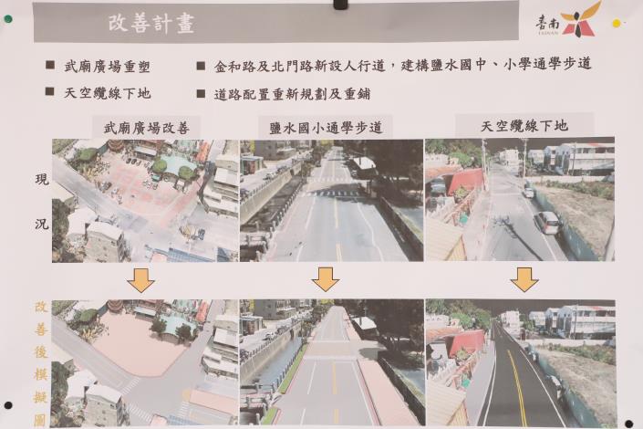 此次計畫重新規劃鹽水區北門路及金和路停車空間、建置人行道、植栽綠美化、AC路面刨鋪、天空纜線下地等多元工程項目,打造鹽水武廟周邊人行環境、學校師生通學步道及改善廟前廣場,提供市民、學童及來訪遊客信眾舒適、安全,人行與車行兼顧的優質道路。