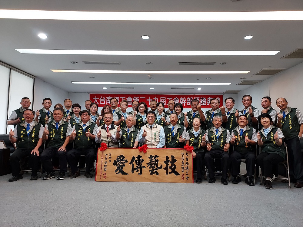 大台南總工會鄭理事長表示,感謝黃市長今天給予總工會第29屆幹部授証、給我們的肯定及鼓勵,總工會在台南市政府的輔導之下、積極投入人才培育任務、更得到勞動部勞動力發展署TTQS評核、全國唯一工會連續11年金牌及102年榮獲國家人才發展獎,此外,為落實職場上優質工安環境、在109年成立(希望家園)安衛家族、目前是全國唯一總工會籌組的安衛家族,並曾在111年榮獲勞動部職安署頒發(希望家園安衛家族核心企業 )奬牌給予肯定!
