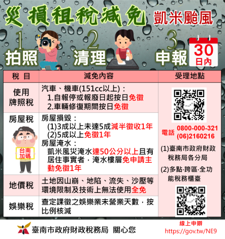 臺南市政府財政稅務局表示,為減輕受災戶之租稅負擔,黃偉哲市長責成財稅局辦理房屋稅減免,淹水入戶達50公分以上房屋且有居住事實者,免徵114年房屋稅,財稅局將依據公所出具之「核發救助金清冊」主動辦理,免由受災戶個別向財稅局提出申請。財稅局舉例說明,某甲所有台南市1間4層樓透天房屋供自住使用,受凱米颱風造成該屋1樓淹水達50公分以上,某甲向所在地公所申請災損補助並經核准,財稅局會依公所出具核發救助金清冊主動辦理,將該屋1樓部分免徵房屋稅1年。