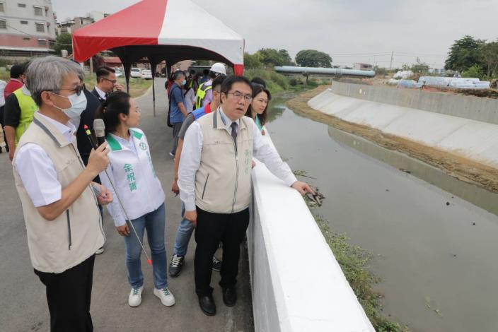 【民進日報記者凃政宏台南報導】台南市長黃偉哲為改善新化市區積淹水問題,積極向中央爭取改善經費,總計投入2億9000多萬元要整治虎頭溪護岸及排水。今(15)日並率隊前往視察虎頭溪排水離子尾橋至穗芳橋護岸治理工程,市議員余柷青也到場關心。