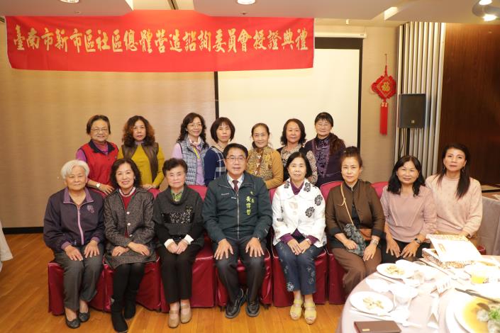 黃偉哲辦理新市社區總體營造諮詢委員會授證並合影。