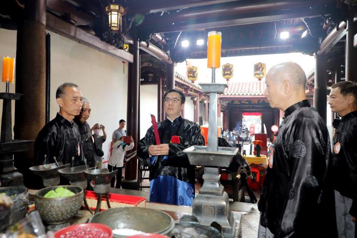 今日儀式依循古禮進行,祭典依啟扉、排班、班齊、執事者各執其事進行,黃偉哲偕同與祭人員行初獻禮、亞獻禮、終獻禮以及分獻禮等流程,向武聖關公致上崇高敬意。