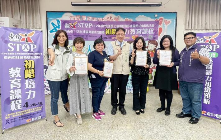【民進日報記者凃政宏台南報導】為落實黃偉哲市長「希望家園、溫暖永續」的施政理念,南市社會局積極推展社區性別暴力初級預防工作,自110年起辦理「社區防暴宣講師」培訓課程,為擴大社區防暴陣容,今(112)年特別結合文化創意部落工作室加碼辦理4場次防暴宣講師培力課程,第一梯次初階培力課程於4月29日、 30日兩天在南區明德里活動中心開跑,昨(30)日下午社會局盧禹璁局長為29位來自社區組織、教育單位、非營利組織及各志願服務團體學員頒發完訓證明,並感謝各領域夥伴的積極參與。