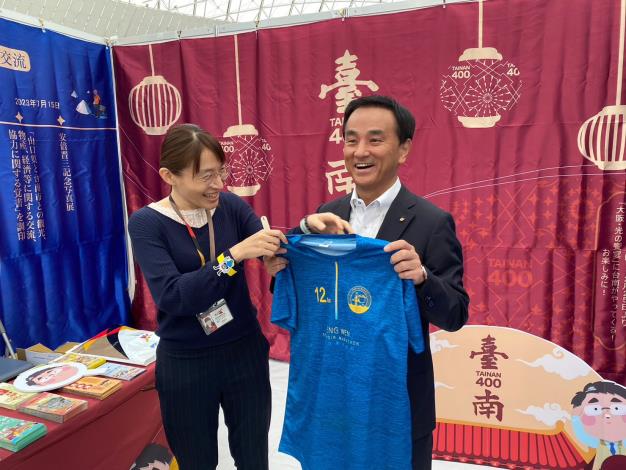 山口縣村岡嗣政知事在8日親自蒞臨台南市攤位,黃偉哲市長知道村岡知事喜歡跑馬拉松,特別安排市府工作人員贈送台南兩大馬拉松–台南古都國際半程馬拉松、曾文水庫馬拉松的紀念T恤給知事,力邀其再來台南,知事也大方允諾將參加台灣燈會開幕式這個迎接台南400的盛會。