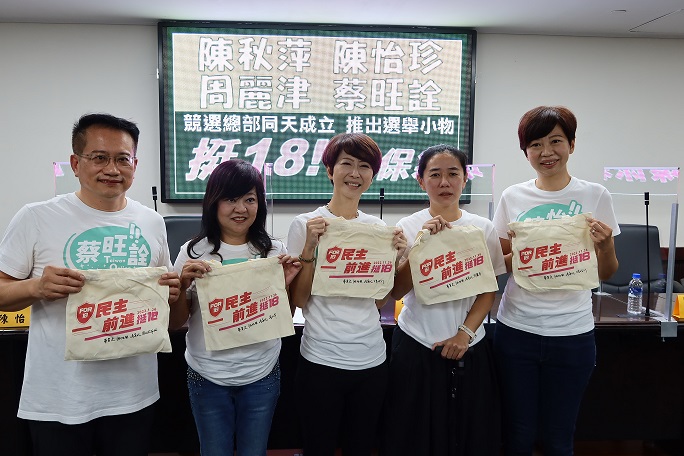 【民進日報記者凃政宏台南報導】立法委員陳亭妃偕同台南市議員陳秋萍、陳怡珍、周麗津與蔡旺詮今日聯合召開記者會,預告將於本週日(11月6日)舉辦競選總部成立大會,並聯手設計紀念選舉小物「挺18!GO!GO!GO!」環保袋,除了全力宣傳18歲公民權理念,在選舉造勢之餘也倡導環保帶著走概念,參加活動之後也能永續使用,減少一次性浪費的垃圾。