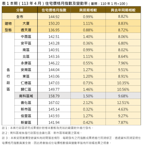 臺南市住宅價格指數113年4月住宅價格指數微幅上升0.99% 。