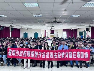 臺南市政府民政局落實役男民防勤務技能辦理替代役法紀教育在職訓練。