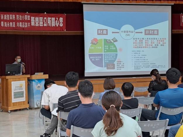 本次說明會新營區公所蔡綉惠主任秘書及政風處張堯星副處長到場致詞。蔡主任秘書表示,陽光法案不僅能確保公職人員清廉作為,也能杜絕不當利益輸送,是實現廉能政治不可或缺的一環,感謝政風處邀請兩位富有經驗的政風室主任來講授廉政倫理規範、公職人員利益衝突迴避及財產申報法令規定及案例,希望同仁能深入瞭解及遵守相關法規內容,以營造機關廉潔風氣。