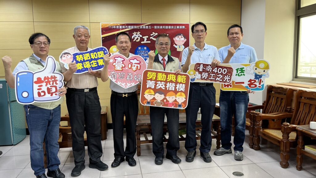 【民進日報記者凃政宏台南報導】為慶祝113年五一勞動節,並肯定各基層勞工對社會、經濟發展的貢獻,臺南市政府勞工局每年辦理模範勞工選拔活動,透過各產、職業工會及事業單位推薦,台南市總工會、大台南總工會、台南市工業會及臺南市總工業初審,並經本市模範勞工評審小組決選,評選出本市年度模範勞工。