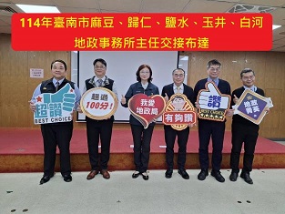 臺南市政府地政局於今(16)日下午3時在永華市政中心11樓訓練教室舉行鹽水、玉井、麻豆、歸仁及白河等5地政事務所主任聯合布達、交接暨宣誓就職典禮,由陳淑美局長主持。