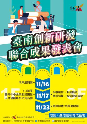 【民進日報記者凃政宏台南報導】臺南創新研發聯合成果發表會,將於11月16日至11月23日在贏地創新育成基地展開,齊聚112年臺南市SBIR結案執行優良以及協助市政公共服務數位化等21家業者成果、112年度臺南中小企業服務團暨人才培訓媒合計畫與贏地創新育成基地聯合辦理,展現臺南在扶植產業創新的成果與能量。