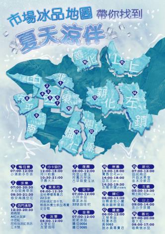 市場處長王俊博表示,這次推出的市場冰品地圖包含了西門淺草市場江水號、永樂市場修安豆花、水仙宮青草茶、東菜市阿粉姨紅茶牛乳、鹽水觀光美食城麒杬茶坊、六甲市場中信商行等多種冰品和飲品供大家選擇,無論是古早味冰品還是創新口味,臺南市場都能滿足大家的需求,提升市民對於臺南市場的認識,詳細活動內容可至「臺南市市場巡禮粉絲專頁」及「臺南市市場處官網」查詢。