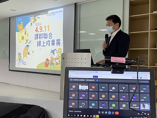 南臺科大朱志良副校長為「 4‧9‧11創新課程線上成果展」開展式致詞,參展師生於線上觀禮的畫面。(記者黃伃綵攝)