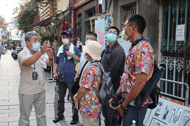 台南市文化協會鄭道聰創會會長(左一)於五條港文化會館前為走讀活動作開場之情形。(記者黃伃綵攝)