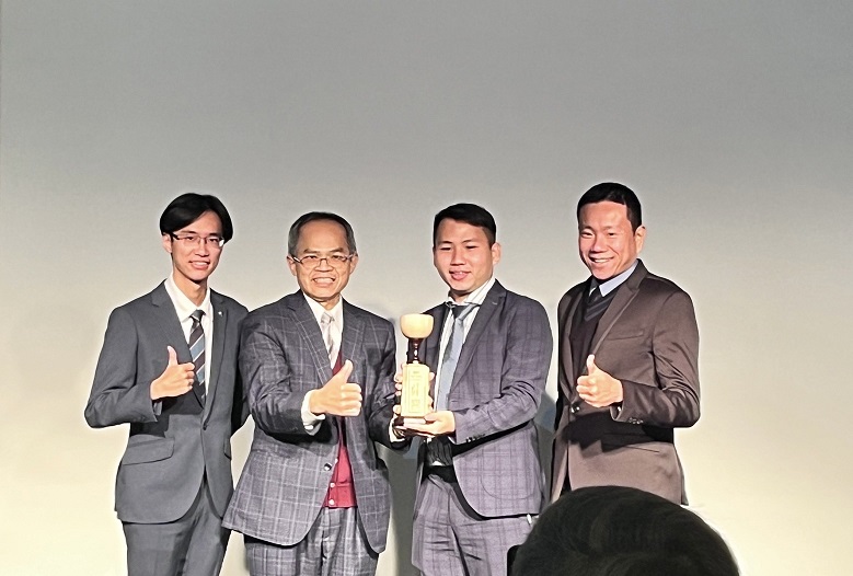 南臺科大新創團隊勇奪TiC100社會創新實踐家社會貢獻獎(由右至左)電機系施金波副教授、觸覺科技有限公司負責人楊豐憶同學、精營管理顧問公司蔡適陽董事長及劉宇豪同學等合影。(記者黃伃綵攝)