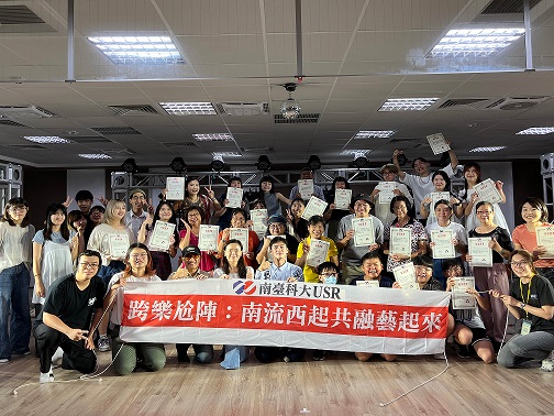 南臺科技大學「跨樂尬陣:南流西起共融藝起來」USR計畫日前舉辦在地實驗音樂劇演員培訓成果展大合照。