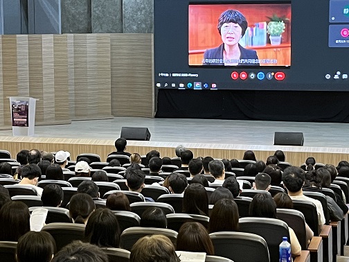 財團法人語言測驗訓練中心(LTTC)李欣穎執行長於「2022雙語教育創新教學與評量研討會」視訊開場致詞。(記者黃伃綵攝)