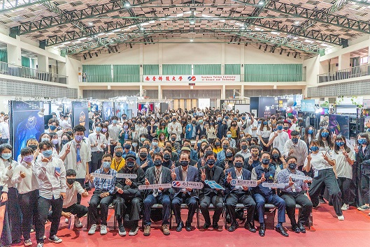 南臺科技大學數位設計學院111級畢業展疊代→映現全體長官師生大合影。(記者黃伃綵攝)