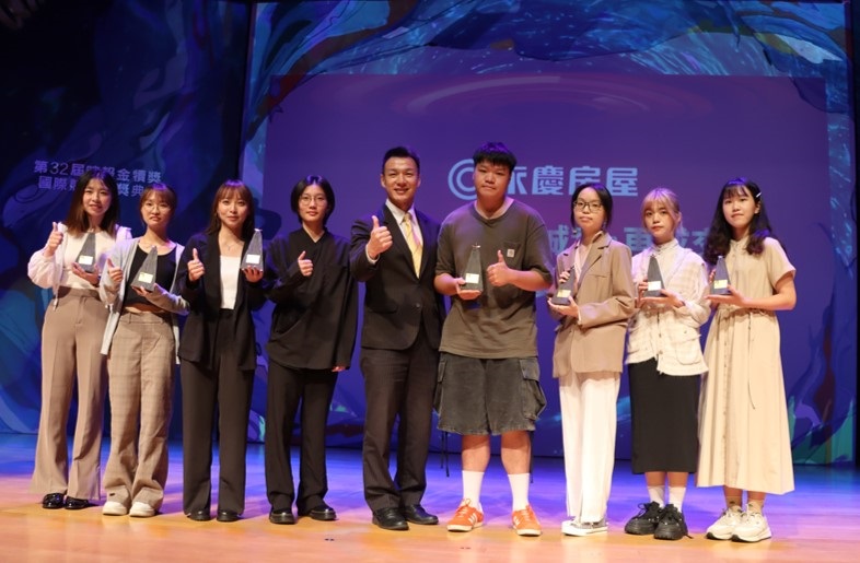 南臺科大資傳系郭柏維同學(右4)團隊榮獲第32屆時報金犢獎國際競賽永慶房屋「先誠實,再成交」品牌形象廣告設計獎-非平面類全球總決選「金犢獎」與臺灣分賽區「第一名」殊榮;視傳系柯而君同學以作品「手摺誠屋」 榮獲永慶房屋-平面類「第一名」。(記者黃伃綵攝)