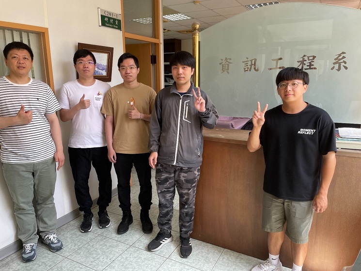 南臺科大資工系獲獎選手合照,(由右至左)謝明軒同學、蔡士煒同學、鄭昀賾同學、鄭昀曜同學、洪國鈞教授。。(記者黃伃綵攝)