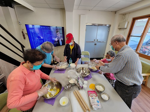 高齡長輩於南臺科大青銀共創USR團隊設置之工作站進行烘焙。(記者黃伃綵攝)