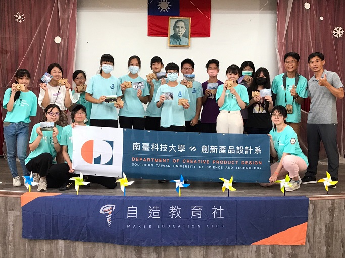 南臺科大自造教育社首度跨海至澎湖舉辦自造教育營隊,與將澳國中、將軍國小近30位師生攜手完成相機製作並拍下家鄉之美,活動尾聲由學童上臺分享拍攝作品,並票選出最具故事性的家鄉照片,為三天兩夜的營隊畫下感動的句點。南臺科大自造教育社社員江欣容表示,此次自製相機是全新開發的教案別具挑戰性,藉由參與營隊獲得許多課堂外實踐經驗,在澎湖留下難忘的回憶。社團指導老師許瑞鋒表示,讓學童們在體驗自造樂趣外更透過相機深入了解家鄉的人、事、物,是南臺科大偏鄉教育USR計畫及自造教育社舉辦此次營隊最大的期盼。